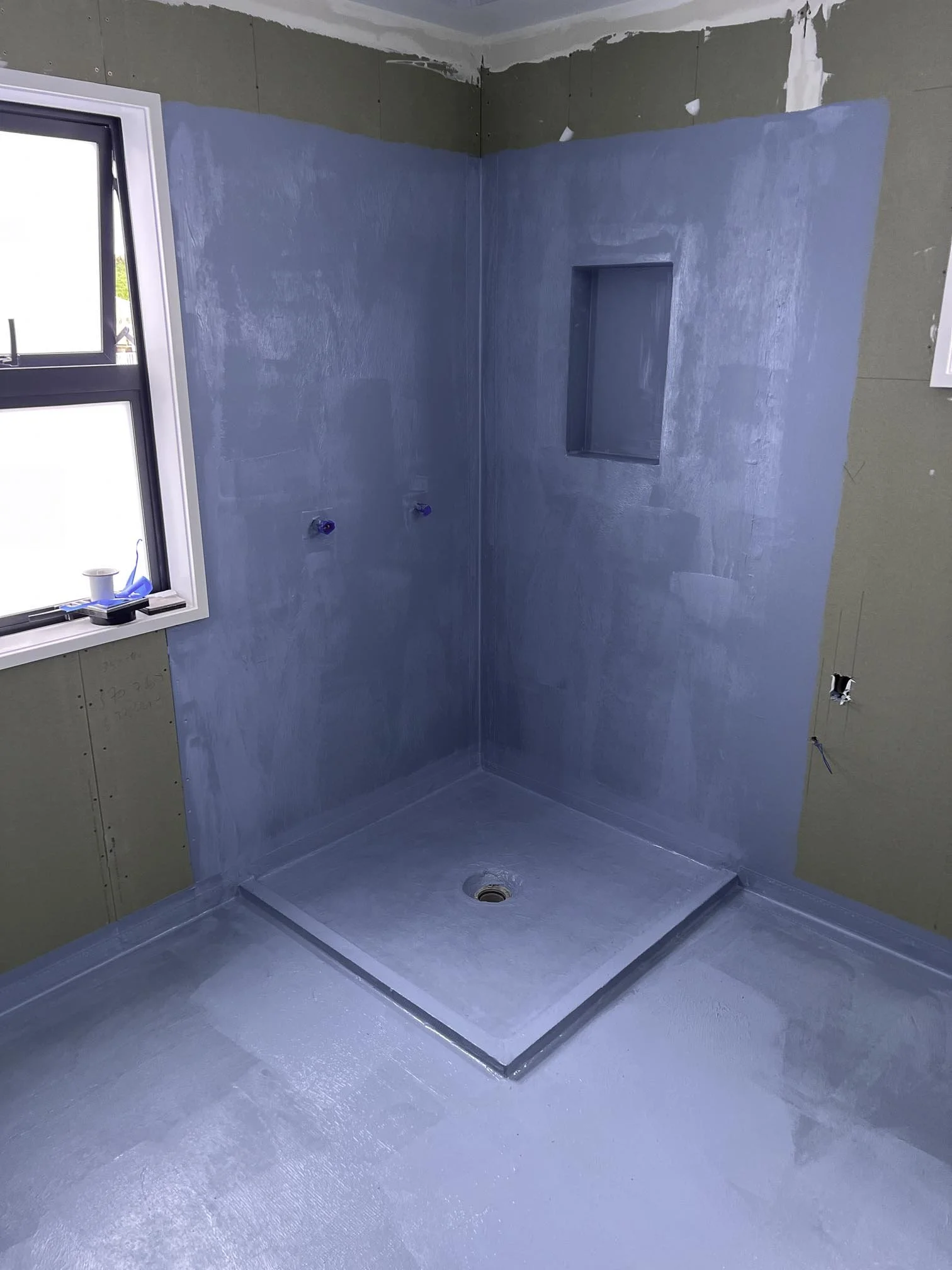 Bathroom under construction with blue waterproofing applied to shower area, showing shower base, wall niche, and window.